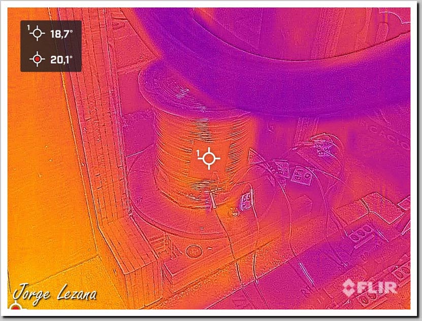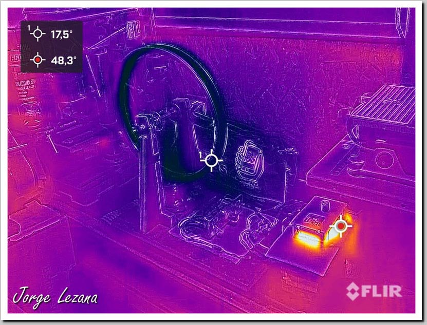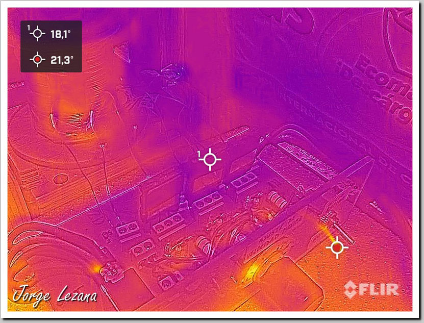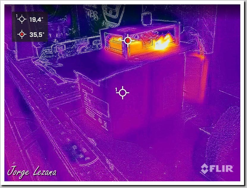 En la Fotografías siguientes verán termografías realizadas después de 24 Hrs. de trabajo del Bedini SG en cada fotografía verán 2 Spot, uno que está en la parte central de la pantalla y uno en rojo que es el punto más caliente de la toma, que puede detectar zonas mas calientes fuera del SG.