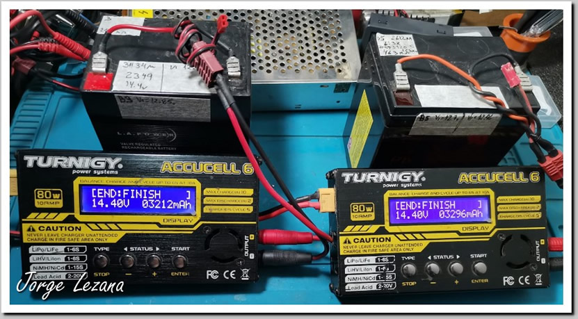 Cargadores mostrando la carga final de cada bateria despues del acondicionado con el SG-BediniUtilizando el Modo 2 de la placa de control (Gestión por Tiempo), se programó una rotación cíclica cada 10 minutos. En este proceso, una batería alimenta el sistema mientras la otra recibe el pulso radiante, intercambiando sus roles de manera indefinida hasta que el banco completo alcanza el umbral crítico de 10.8V.