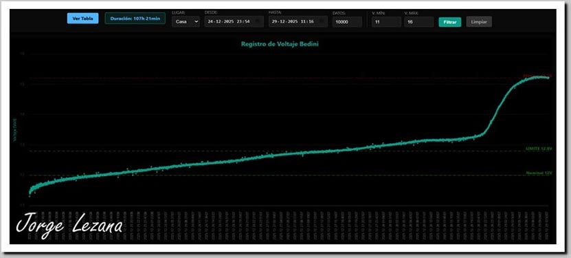 Grafico de Carga con sistema SGEste apartado documenta la evolución electroquímica y la consolidación del banco de potencia principal, compuesto por dos unidades de ácido-gel (12V / 4.5Ah nominales). El proceso evidencia la capacidad del Bedini SG para revertir la degradación por sulfatación profunda.