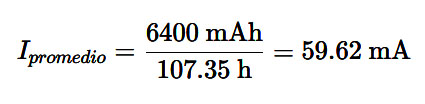 Para determinar la corriente media (de manera estimativa) que fluyó hacia las baterías, aplicamos la relación directa entre la capacidad recuperada y el tiempo de ejecución: