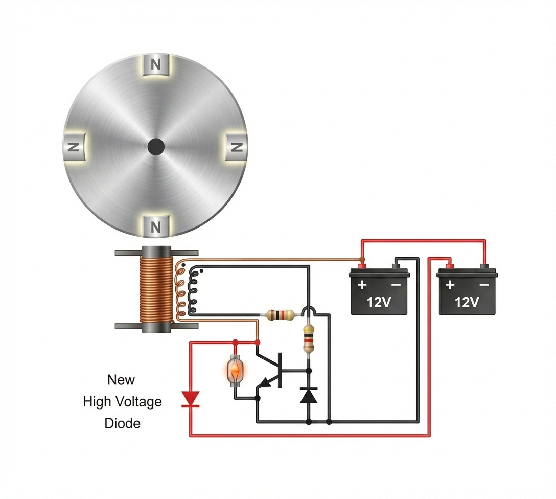 Cuando la corriente se interrumpe súbitamente mediante el circuito de conmutación de estado sólido, el campo magnético colapsa casi instantáneamente. En un motor normal, este pico se desperdicia o daña los componentes; en el Bedini SG, este pulso de Energía Radiante de alta tensión es rectificado y dirigido hacia un banco de baterías o condensadores.