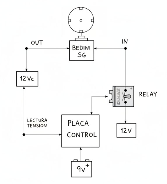 OBS: En el diagrama de carga, el Sensor de tensión se puede colocar tanto en la batería de entrada o de salida, según se requiera o dependiendo el modo de trabajo a usar.