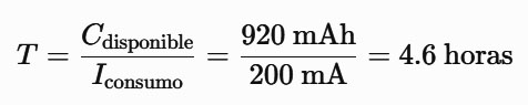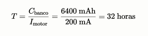 Utilizando los parámetros nominales de consumo del motor, se calculó el tiempo de funcionamiento esperado mediante la relación de capacidad y demanda de corriente: